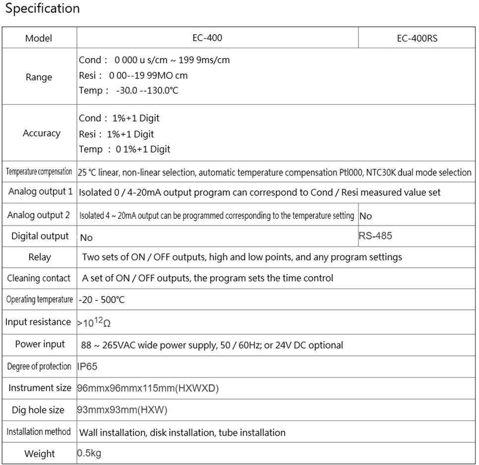 ■ With two 0/4 ~ 20mA output corresponding to set Cond / Resi, Temp